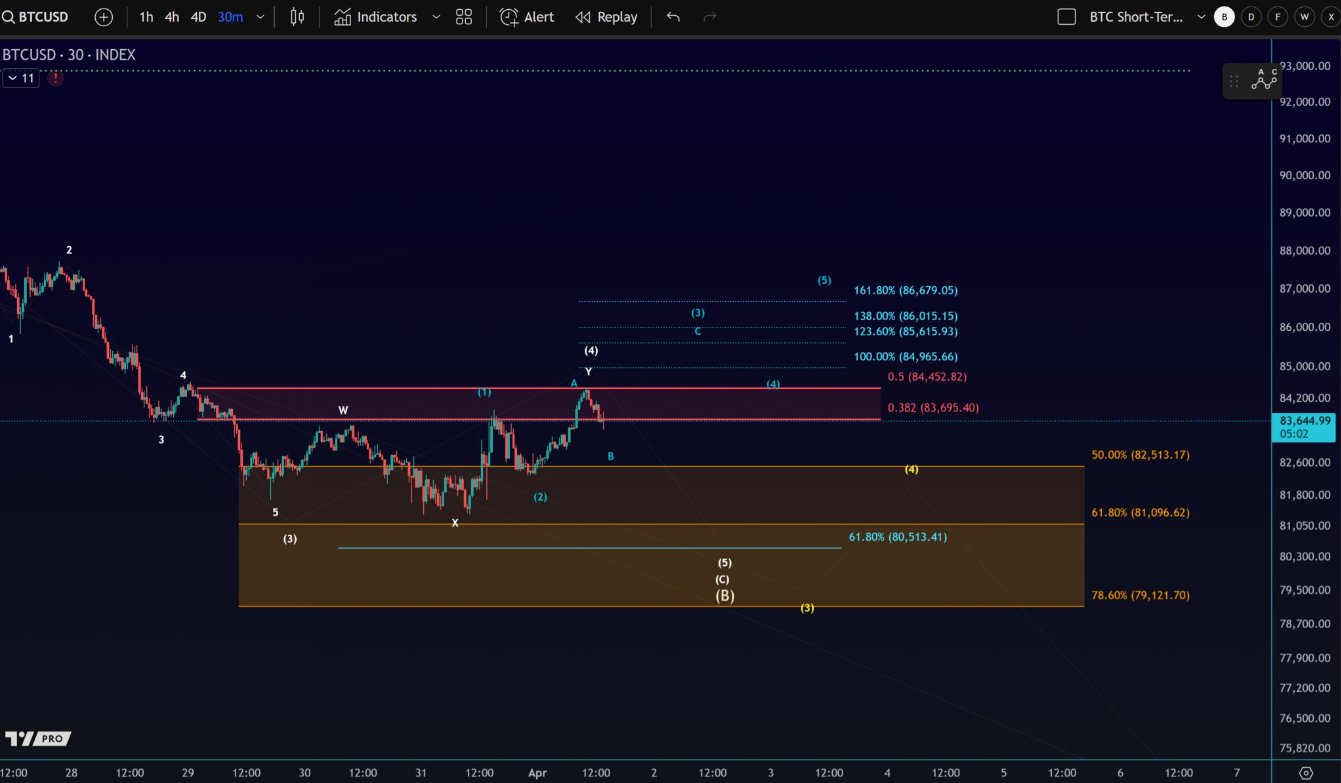Dữ liệu từ TradingView cho thấy BTC/USD dao động mạnh trong phạm vi giao dịch hàng tuần, quanh mức $84.000.