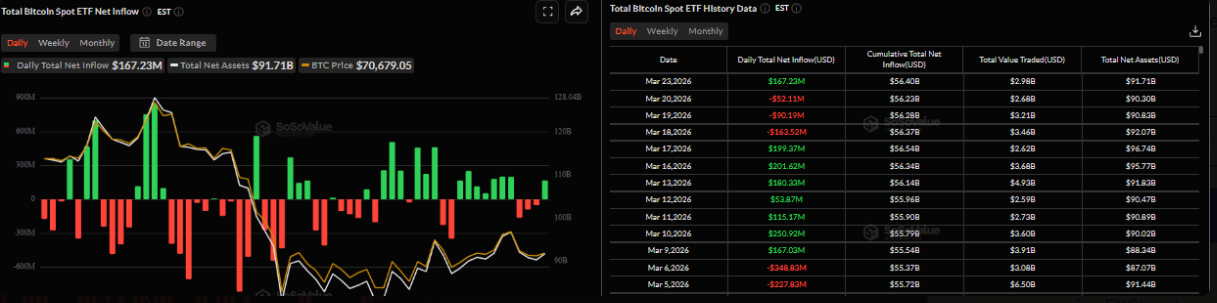 Nhu cầu từ khối tổ chức mở đầu tuần với tín hiệu tích cực. Theo dữ liệu từ SoSoValue, các quỹ Bitcoin ETF giao ngay ghi nhận dòng tiền vào đạt 167,23 triệu USD trong ngày thứ Hai, qua đó chấm dứt chuỗi ba phiên liên tiếp bị rút vốn. Nếu đà này được duy trì và mở rộng, Bitcoin nhiều khả năng sẽ tiếp tục phục hồi.