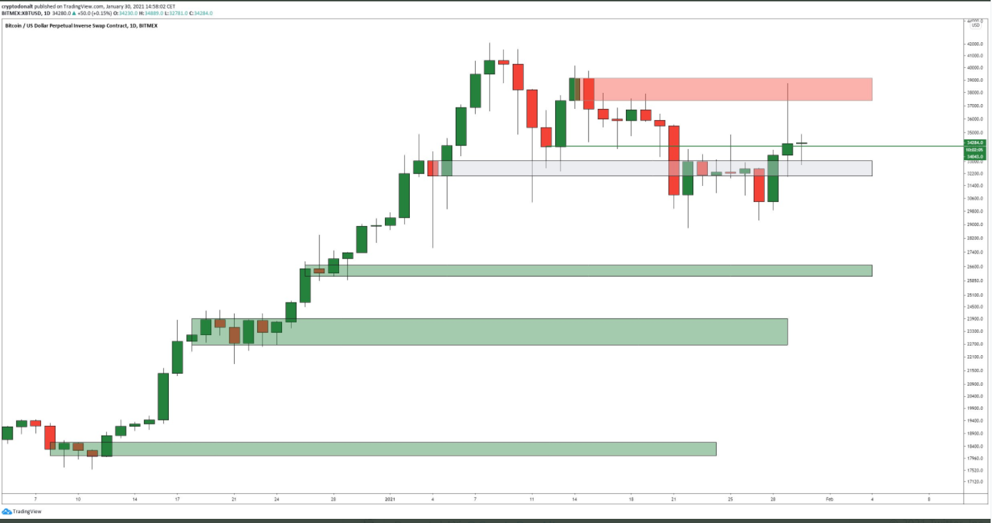 Một nhà phân tích giải thích rằng $ 34.000 là mức quan trọng cần theo dõi trong ngắn hạn, vì mức đóng cửa hàng ngày trên hoặc dưới mức này có thể xác định số phận trong ngắn hạn của Bitcoin.