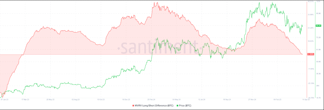Chênh lệch MVRV Long/Short, số liệu quan trọng được sử dụng để đánh giá tâm lý thị trường, cho thấy xu hướng đáng lo ngại đối với LTH. Chỉ báo này gần đây đã chạm mức thấp nhất trong hai năm, cho thấy lợi nhuận của holder dài hạn đang ở mức thấp nhất kể từ tháng 3/2023. Sự thay đổi này cho thấy điều kiện thị trường ngày càng bất lợi đối với LTH.