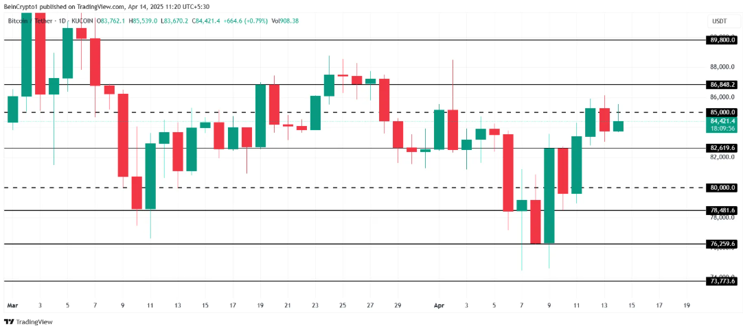 BTC hiện đang được giao dịch quanh $84.900, lơ lửng ngay trên mức hỗ trợ quan trọng $82.619. Giá vẫn bị kẹt dưới mức kháng cự quan trọng $85.000, điều này có thể gây thêm áp lực nếu tài sản hàng đầu không vượt qua được mức này.