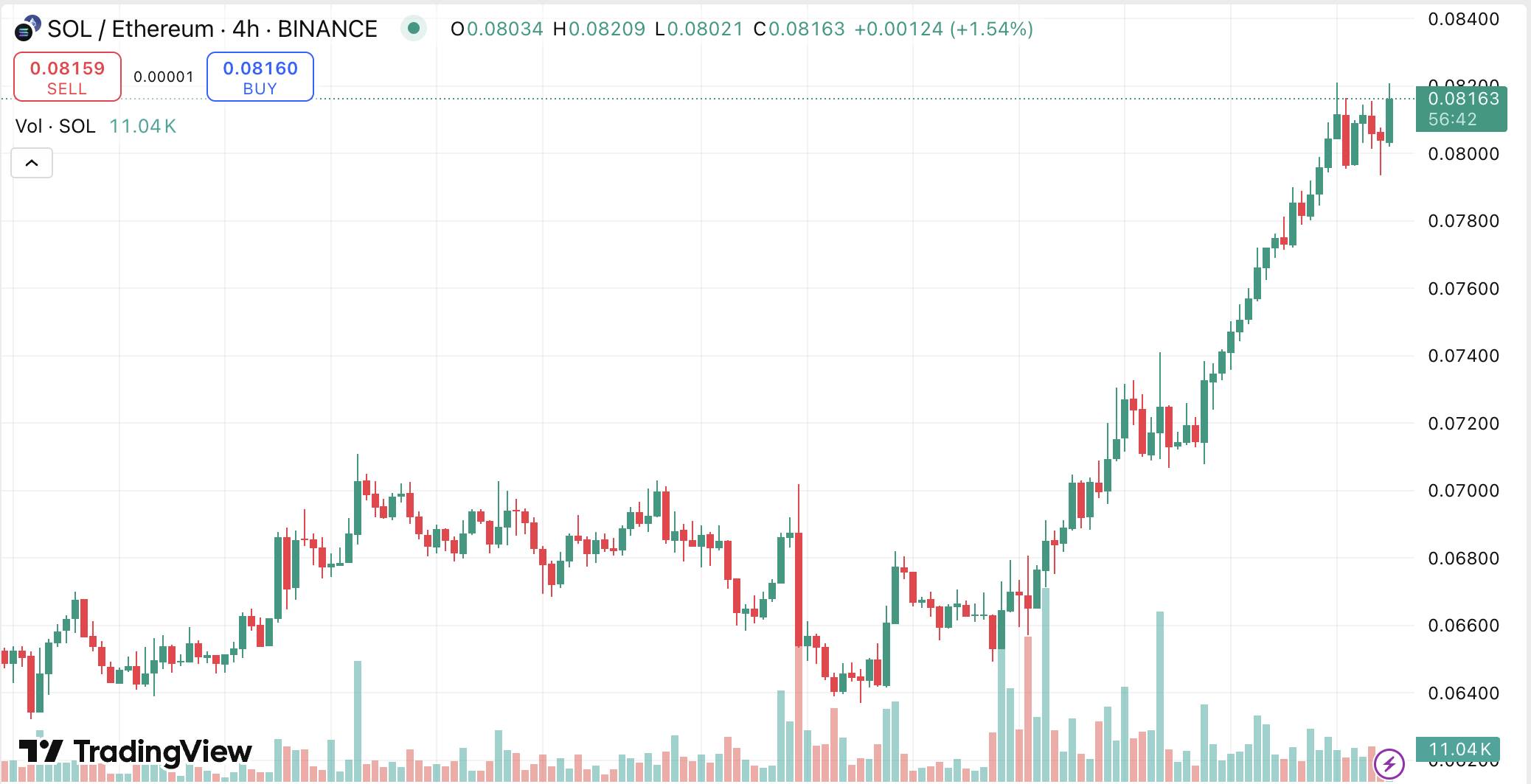 Theo dữ liệu từ TradingView, tỷ giá SOL/ETH đã đạt mức đỉnh kỷ lục mới là 0,082 vào ngày 13/04, tăng hơn 35% so với tháng 08/2024 khi tỷ lệ này vẫn còn quanh ngưỡng 0,06.