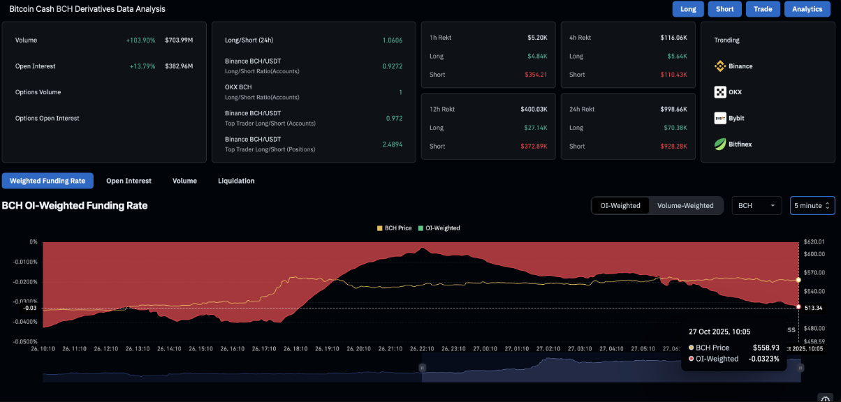 Hòa nhịp với xu hướng đó, thống kê từ CoinGlass ghi nhận hợp đồng mở (OI) của hợp đồng tương lai BCH đã tăng 13,8% trong vòng 24 giờ, đạt 382,96 triệu USD. Đà tăng của OI phản ánh tâm lý “ưa rủi ro” đang trở lại, khi giá trị danh nghĩa của các vị thế Long ngày càng lớn.
