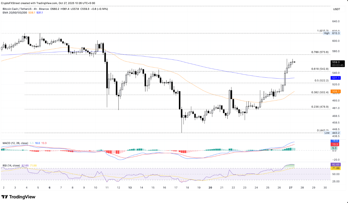 Sau khi tăng mạnh 10% trong ngày Chủ nhật, Bitcoin Cash (BCH) đang tạm “nghỉ chân” quanh mốc 560 USD. Tại thời điểm viết bài, đồng coin này duy trì trạng thái đi ngang trong biên độ hẹp giữa hai mức Fibonacci thoái lui 78,6% và 61,8%, tương ứng 573 USD và 542 USD.