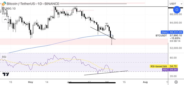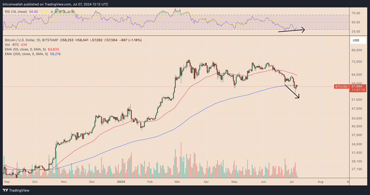 Lần giảm giá Bitcoin mới nhất đi kèm với phân kỳ ngày càng rộng giữa giá giảm và chỉ số sức mạnh tương đối (RSI) đang tăng. Phân kỳ này thường cho thấy áp lực bán suy yếu, mặc dù giá tiếp tục giảm.