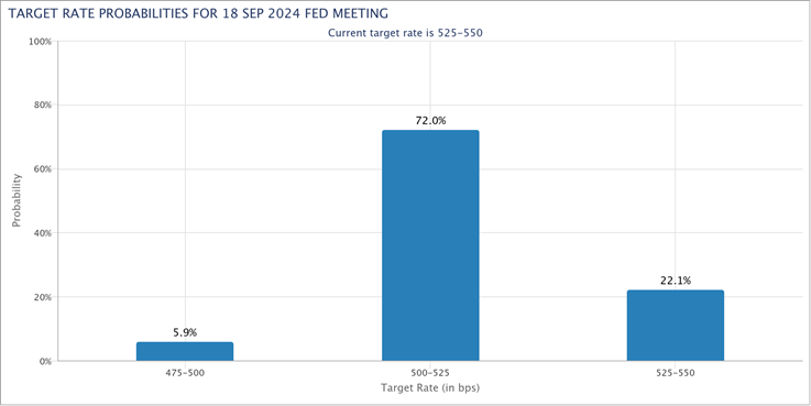 Tính đến ngày 7/7, các trader ở Phố Wall nhận thấy 72% khả năng Cục Dự trữ Liên bang Hoa Kỳ (Fed) sẽ cắt giảm lãi suất 25 điểm cơ bản, theo dữ liệu do CME thu thập. Một tháng trước, xác suất xảy ra điều tương tự là 46,6%.