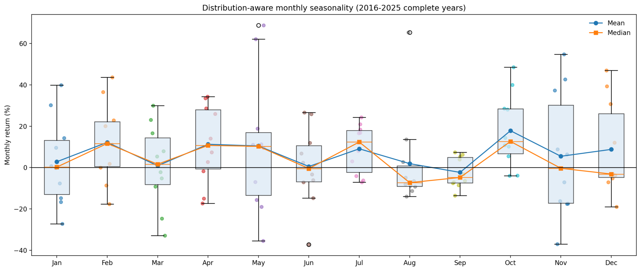 Nói cách khác, có những tháng mà xu hướng (mean, median, win rate) đồng thuận. Nhưng cũng có những tháng mà biến động chi phối, và con số trung bình chỉ mang tính “kể chuyện” hơn là dự báo.