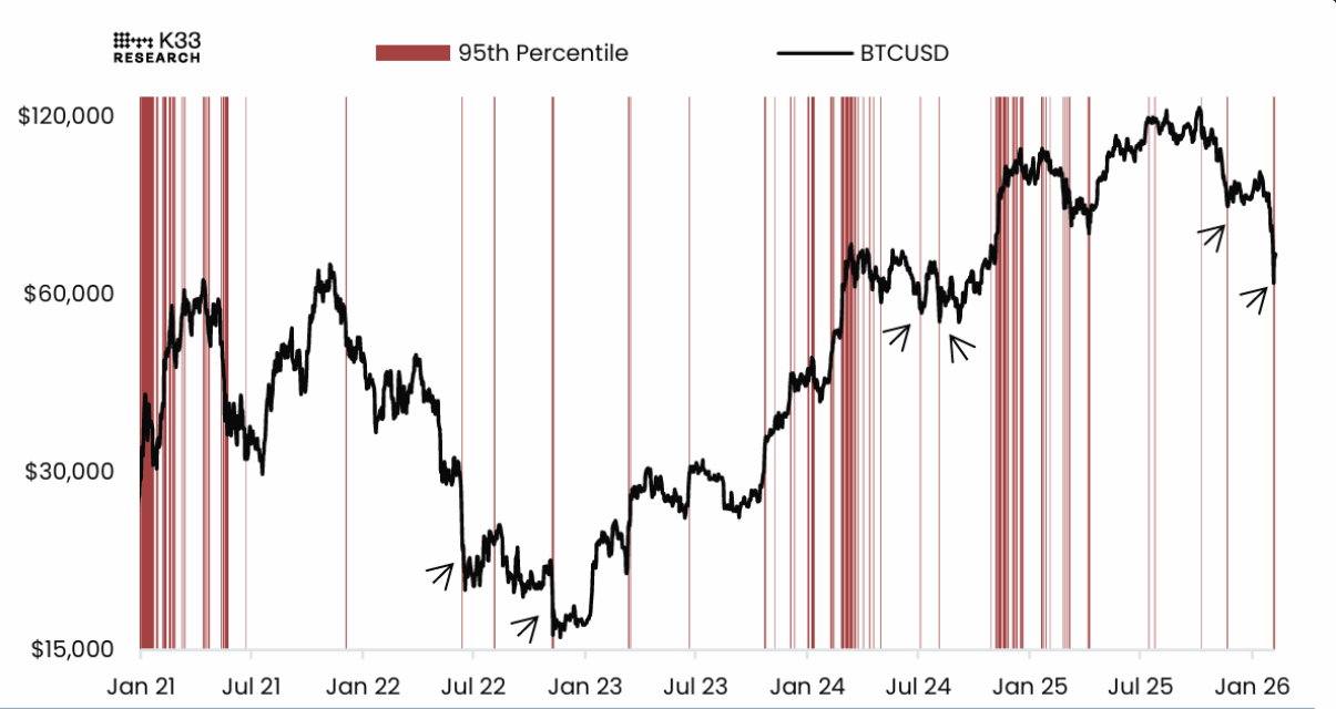 Báo cáo mới nhất từ K33 cho thấy những cú bùng nổ về khối lượng giao dịch thường xuất hiện tại các điểm cực trị cục bộ của thị trường. Nhóm phân tích đã đối chiếu hiệu suất BTCUSD với những phiên có khối lượng nằm trong nhóm 5% cao nhất so với đường trung bình động 365 ngày, qua đó nhận diện các thời điểm dòng tiền biến động bất thường.
