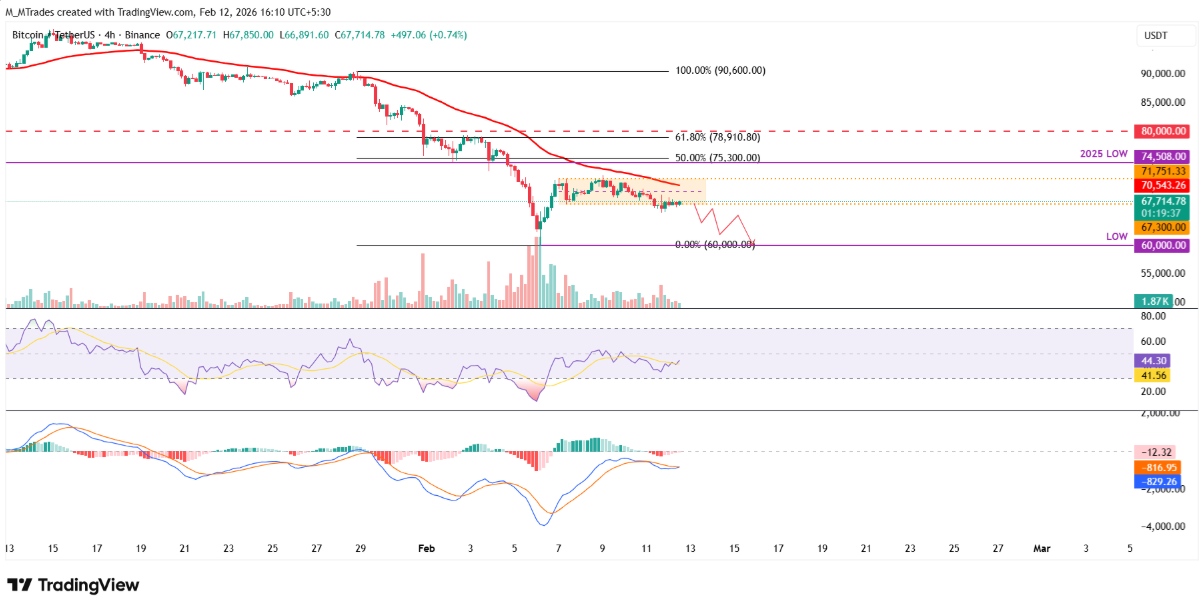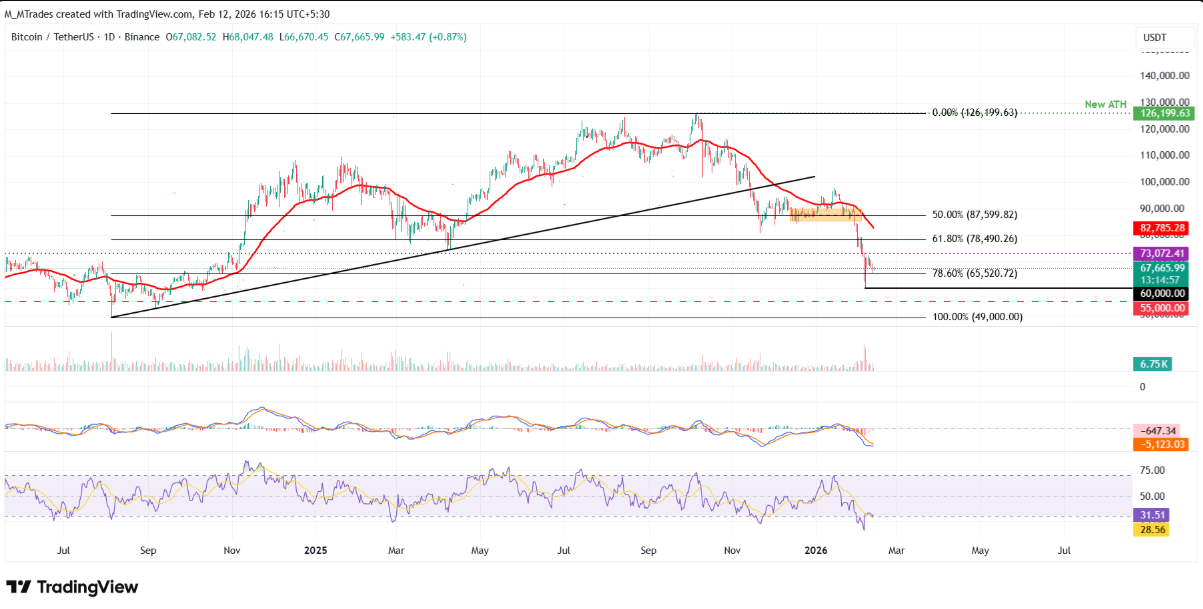 Trên khung ngày, Bitcoin từng bị từ chối tại kháng cự 73.072 USD vào Chủ nhật, sau đó giảm gần 5% đến hết ngày thứ Tư và lùi sát mốc Fibonacci thoái lui 78,6% tại 65.520 USD (đo từ đáy tháng 8/2024 ở 49.000 USD lên đỉnh lịch sử tháng 10/2025 tại 126.199 USD). Sáng thứ Sáu, BTC giao dịch quanh 67.600 USD.