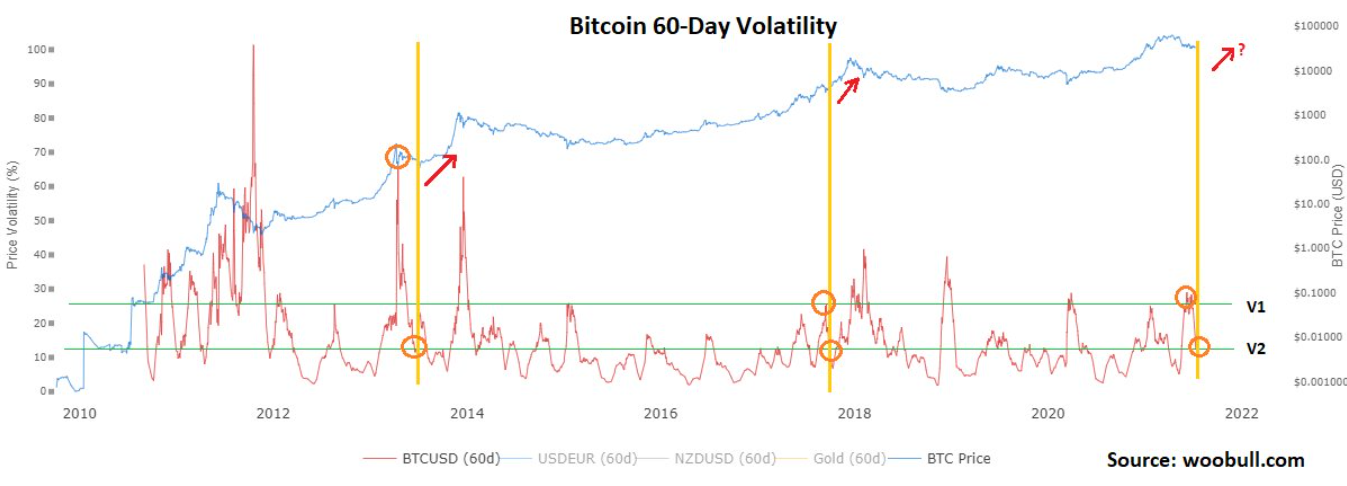 Trong khi đó, nhà phân tích Allen Au đã lưu ý đến một mô hình và chỉ ra rằng, sau khi biến động 60 ngày của BTC tăng lên trên V1 và giảm trở lại V2 hoặc thấp hơn, giá của BTC sẽ tăng lên. Điều này đã xảy ra trong giai đoạn tăng trưởng 2013 và 2017.