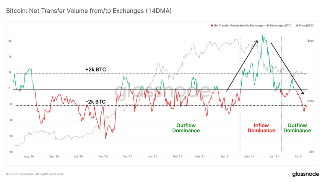 Theo Khối lượng chuyển khoản ròng từ các sàn giao dịch của Glassnode trong hai tuần qua, xu hướng này có thể đảo ngược. Trong giai đoạn này, đã có nhiều dòng chảy ra tích cực hơn từ các sàn giao dịch với 2.000 BTC được rút ra khỏi các sàn giao dịch mỗi ngày.