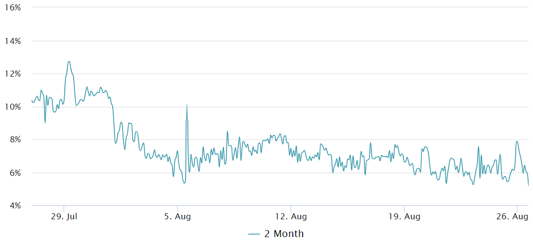 Phần trăm chênh lệch giá Bitcoin tương lai – một chỉ báo quan trọng về khẩu vị rủi ro đối với các sản phẩm phái sinh – đã chững lại ở mức khoảng 6% trong tháng qua. Điều này cho thấy nhiều trader chuyên nghiệp vẫn thận trọng trong việc mở các vị thế mua có đòn bẩy.