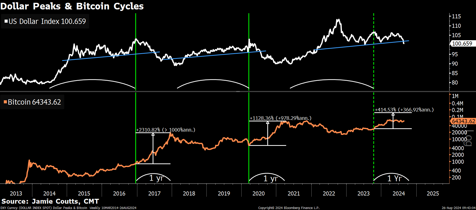 Coutts lưu ý rằng trong hai chu kỳ tăng giá trước đó, Bitcoin đã thiết lập các mức cao nhất mọi thời đại mới trong vòng 365 ngày sau khi Chỉ số Đô la Mỹ (DXY) đạt đỉnh cục bộ.