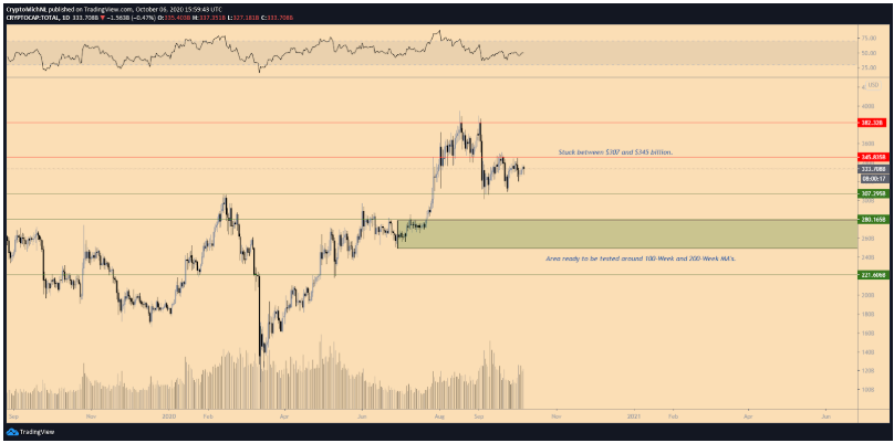 Vì giá Bitcoin dao động giữa các cập độ chính, nên tổng vốn hóa thị trường của toàn bộ ngành cũng vậy. Những gì biểu đồ cho thấy là sự sụt giảm rõ ràng về mức hỗ trợ, sau đó nó dao động trong khoảng từ $ 307 đến $ 338 tỷ.
