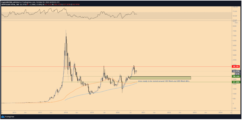 Vì tổng vốn hóa thị trường đã bị từ chối ở mức kháng cự $ 380 tỷ nên việc kiểm tra lại các khu vực $ 255- $ 280 tỷ là một kịch bản rất có thể xảy ra, điều này cũng sẽ dẫn đến sự xác nhận lại đường MA 100 tuần và 200 tuần.