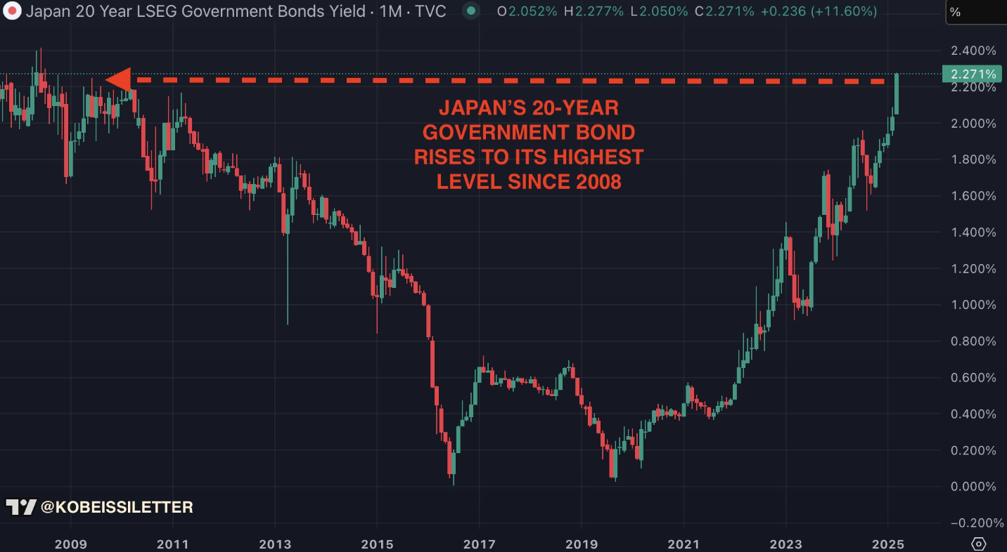 Nhà đầu tư tiền điện tử có thể sắp đối mặt với những biến động mạnh khi lợi suất trái phiếu chính phủ Nhật Bản kỳ hạn 20 năm tăng vọt lên mức cao nhất kể từ năm 2008 – một diễn biến thường làm gia tăng tâm lý e ngại rủi ro đối với các tài sản như Bitcoin (BTC).