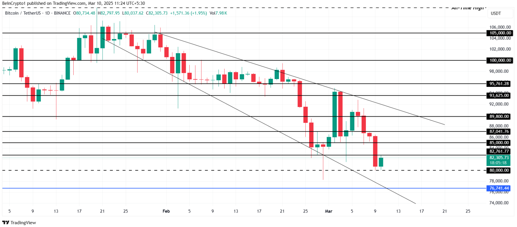 Tuy nhiên, nếu tâm lý nhà đầu tư thay đổi theo hướng tích cực, điều này có thể đảo ngược xu hướng hiện tại. Nếu lượng mua gia tăng quanh ngưỡng hỗ trợ tâm lý $80.000, Bitcoin có thể lấy lại động lực tăng trưởng. Việc vượt qua $82.761 sẽ mở đường để BTC tiến lên $85.000, thậm chí có thể đạt $87.041. Nếu kịch bản này diễn ra, xu hướng giảm giá sẽ bị vô hiệu hóa, và thị trường có thể bước vào một giai đoạn phục hồi mạnh mẽ.