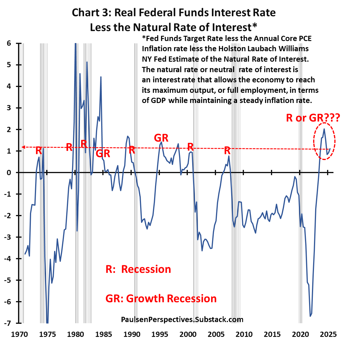 Nhà kinh tế học và nhà đầu tư Jim Paulsen lưu ý rằng, khi các quỹ của Fed giao dịch trên mức lãi suất “trung lập” (Quỹ của Fed trừ đi Chỉ số Chi tiêu tiêu dùng cá nhân cốt lõi hàng năm), nền kinh tế đã từng chuyển sang suy thoái hoặc “suy thoái tăng trưởng”, giai đoạn tăng trưởng chậm chạp với tỷ lệ thất nghiệp gia tăng và nhu cầu tiêu dùng yếu. Các mô hình tương tự kể từ năm 1971 hỗ trợ cho phân tích này.
