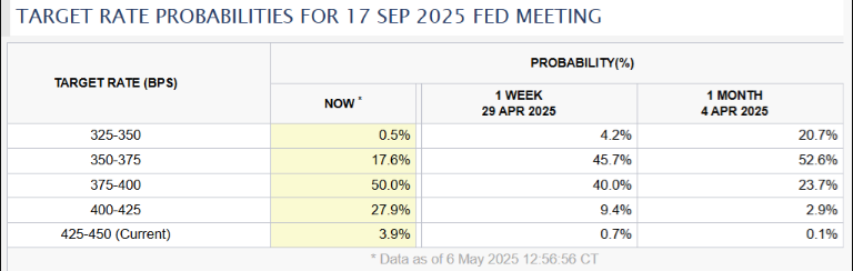 Kỳ vọng của thị trường, được phản ánh trong hợp đồng tương lai lợi suất trái phiếu kho bạc, cho thấy có 76% khả năng lãi suất ở mức 4,0% hoặc thấp hơn vào ngày 17 tháng 9. Theo công cụ CME FedWatch, xác suất này đã giảm mạnh so với mức 90% vào ngày 29 tháng 4.