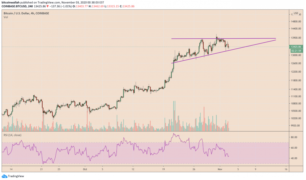 Tuy nhiên, Bitcoin vẫn có xu hướng giảm do áp lực bán đáng kể xuất hiện gần mức kháng cự ngang $ 13.820. Tiền điện tử cũng hình thành một bấc dài phía trên phản ứng với mức này. Về tổng thể, điều đó đã khiến Bitcoin hợp nhất bên trong một mô hình giống như Tam giác tăng dần.