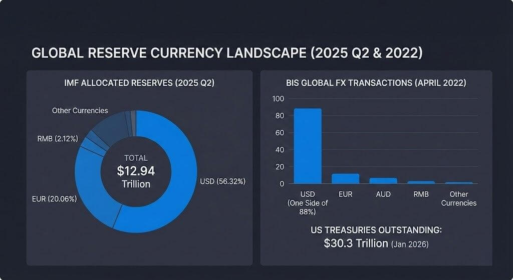 “Con hào” mà các điều kiện này phải vượt qua thể hiện rõ trong dữ liệu vĩ mô: tỷ trọng USD trong dự trữ, vị thế của USD trên thị trường ngoại hối và quy mô tài sản thế chấp Kho bạc Mỹ.
