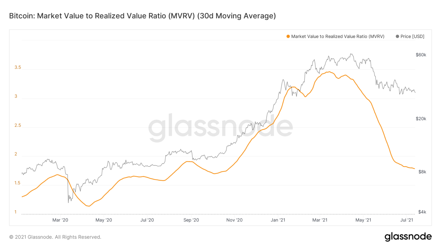 Tỷ lệ MVRV cũng có thể được xem xét, đặc biệt là vì nó góp phần vào các khoản lỗ nói trên. Hiểu một cách đơn giản, MVRV cho thấy lợi nhuận mà các nhà đầu tư đang kiếm được tương ứng với giá trị của BTC. Chỉ số này hiện ở mức 1,7, chia sẻ cùng giá trị với các số liệu được thấy vào tháng 10/2020. Không cần phải nói, thị trường Bitcoin đang có những ngày tốt đẹp hơn.