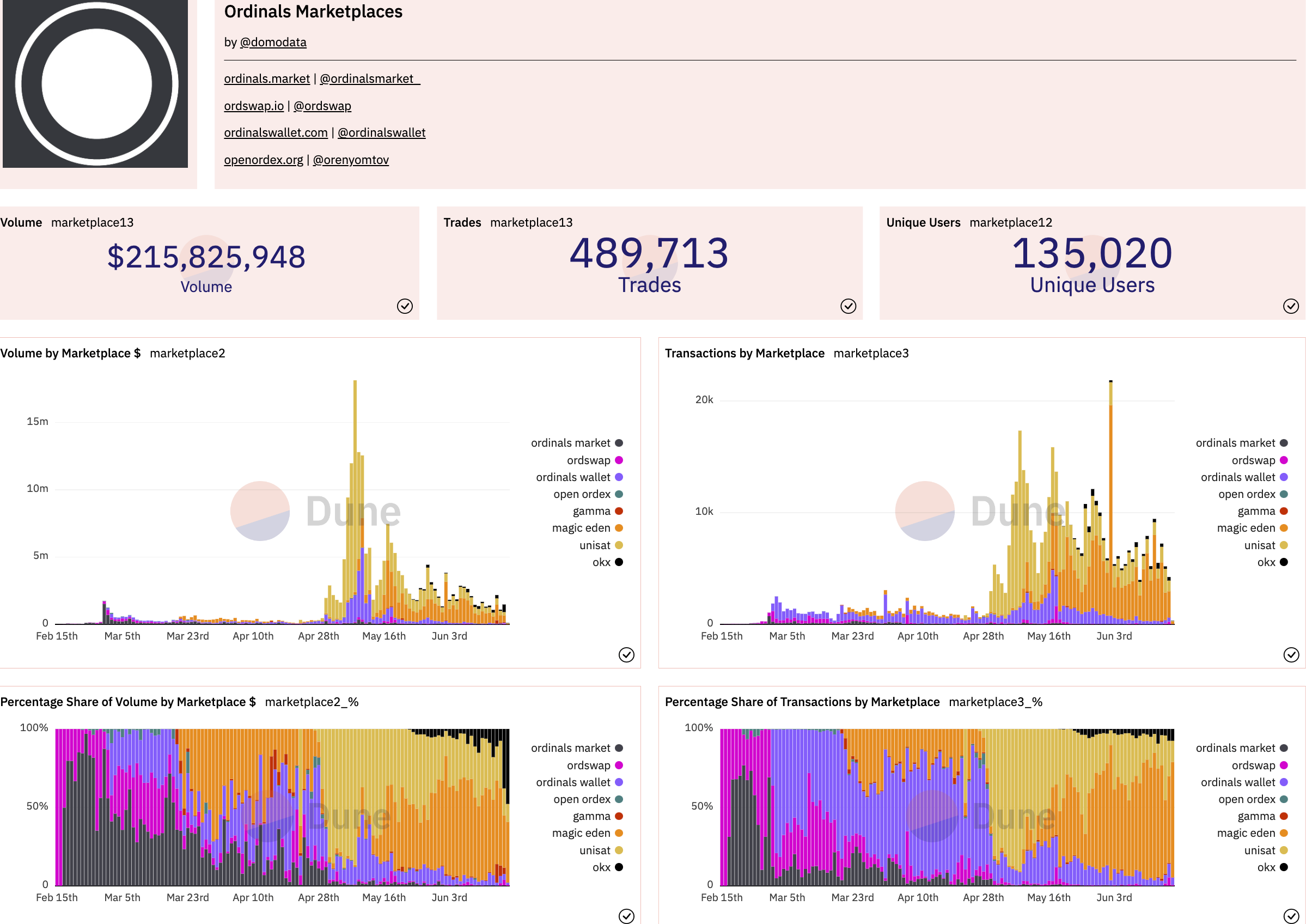 Bất chấp sự sụt giảm đáng kể về định giá thị trường BRC20 trong tháng này, số lượng token BRC20 đã có sự tăng trưởng đáng kể, tăng hơn 38% kể từ ngày 3 tháng 6. Các thị trường như Magic Eden, Okx, Ordinals Market, Ordswap, Ordinals Wallet, Open Ordex, Gamma và Unisat tiếp tục chứng kiến hoạt động giao dịch sôi động của chữ khắc BRC20 và Ordinals.
