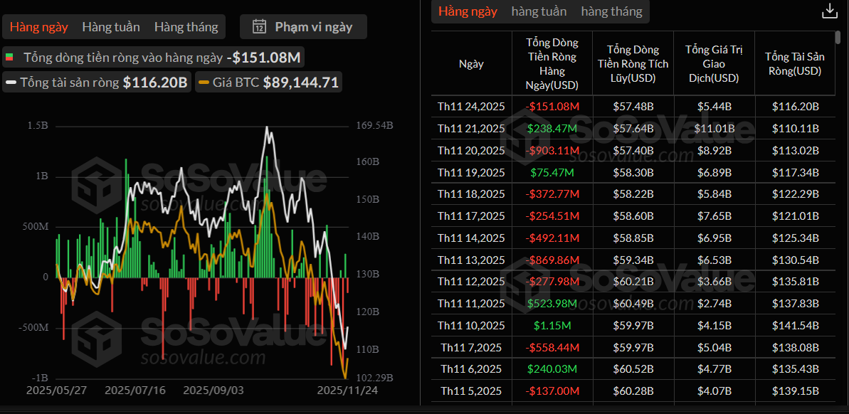 Vào ngày 24 tháng 11, thị trường ETF tài sản số ghi nhận sự phân hóa rõ rệt giữa các đồng tiền mã hóa lớn. Các Bitcoin ETF spot chứng kiến dòng vốn rút ròng tổng cộng 151 triệu USD, đánh dấu sự thay đổi đáng chú ý trong tâm lý nhà đầu tư sau giai đoạn hút vốn ổn định. Trong nhóm này, chỉ có FBTC của Fidelity ghi nhận dòng vốn vào, cho thấy niềm tin có chọn lọc thay vì sự ủng hộ rộng rãi.