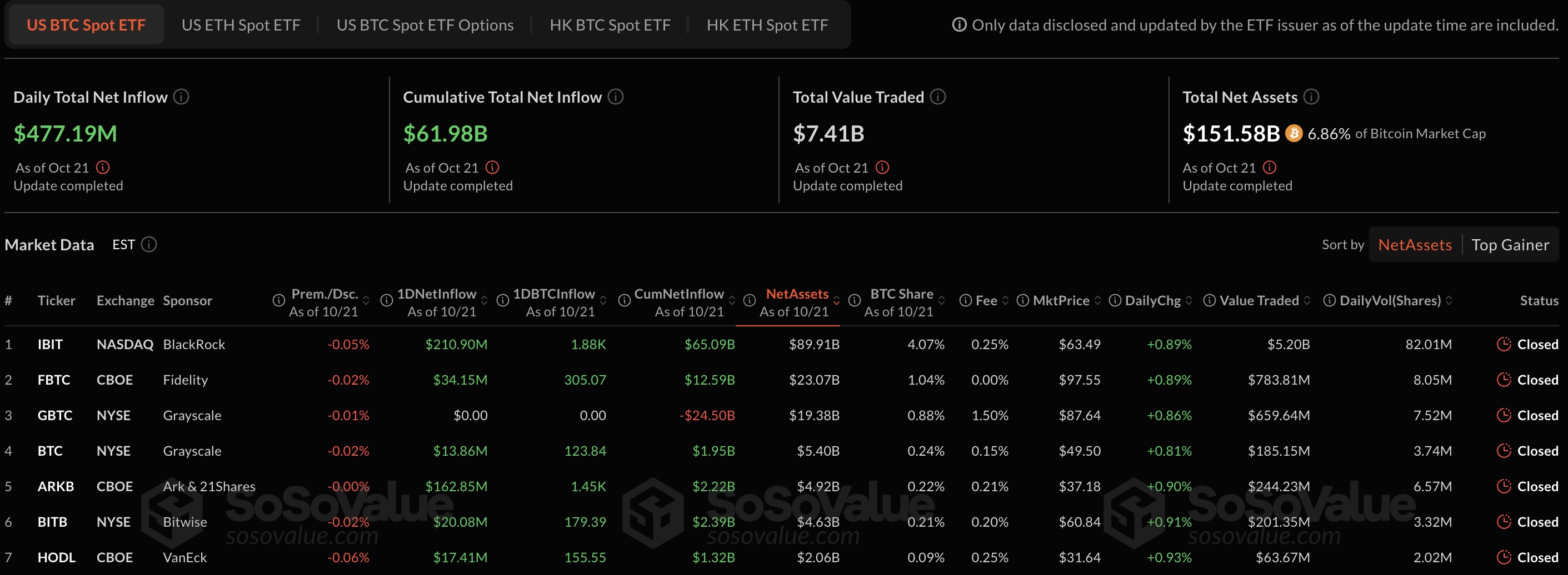 Các quỹ ETF Bitcoin giao ngay tại Mỹ đã trở lại trạng thái dòng tiền ròng dương vào thứ Ba, với tổng giá trị hút ròng 477,2 triệu USD, theo dữ liệu từ SoSoValue.