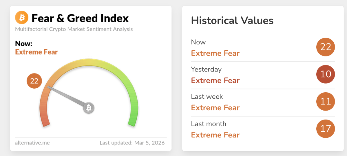 Dù tâm lý chung của thị trường vẫn nằm trong vùng “sợ hãi tột độ”, chỉ số Fear & Greed Crypto đã cải thiện lên mức 22 vào thứ Năm, tăng đáng kể so với mức 10 của ngày trước đó. Diễn biến này cho thấy niềm tin của nhà đầu tư đang dần được củng cố trở lại, ngay cả khi căng thẳng địa chính trị vẫn chưa có dấu hiệu hạ nhiệt.