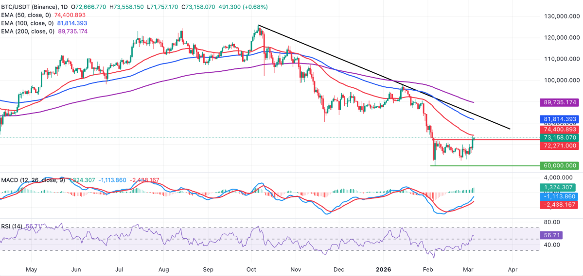 Nếu RSI tiếp tục cải thiện, động lực tăng giá trong ngắn hạn có thể được củng cố, mở ra khả năng Bitcoin tiến tới thử thách đường trung bình động hàm mũ (EMA) 50 ngày tại khu vực 74.400 USD – một ngưỡng kỹ thuật quan trọng đối với xu hướng.