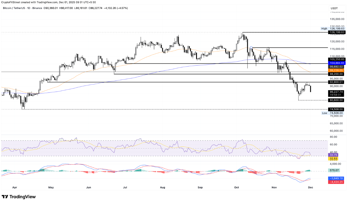 Bitcoin đang giao dịch dưới mức $87.000 tại thời điểm viết bài vào thứ Hai, cho thấy khả năng hình thành một nến marubozu giảm trên biểu đồ ngày. Áp lực bán tiếp tục gia tăng sau khi giá thất bại trong việc giữ mức $92.800 tuần trước, mở ra đà giảm mới.