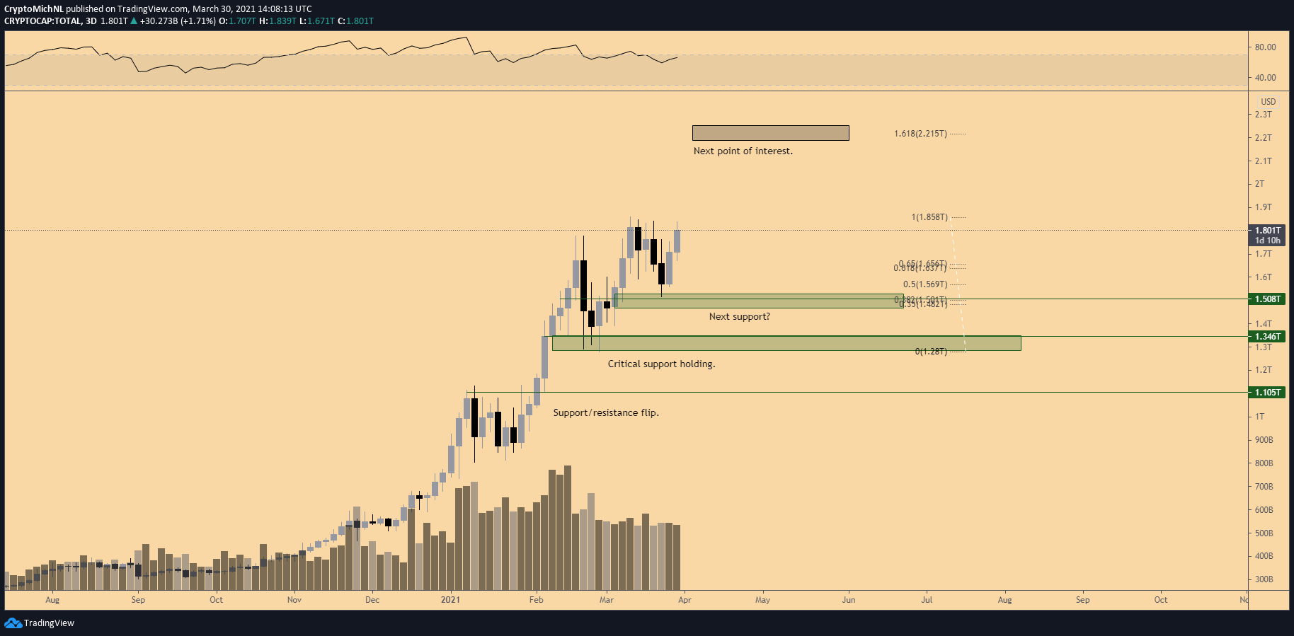Nếu sức mạnh tiếp tục được chứng minh, điểm quan tâm tiếp theo đối với tổng vốn hóa thị trường có thể được tìm thấy ở mức 2,2 nghìn tỷ đô la – cũng được Fibonacci mở rộng xác nhận.