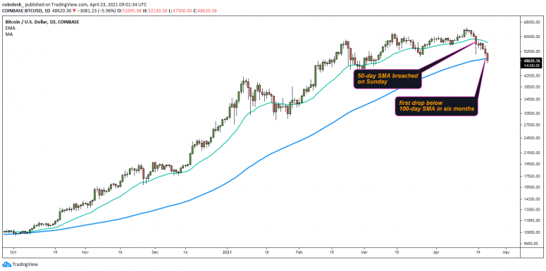 Tiền điện tử lớn nhất giao dịch dưới ngưỡng hỗ trợ trung bình động đơn giản (SMA) 100 ngày là 49.470 đô la trong giờ châu Âu, đánh dấu breakdown (phá vỡ giảm) đầu tiên của đường kỹ thuật được theo dõi rộng rãi trong 6 tháng qua và kéo dài động thái giảm giá gần đây từ mức cao kỷ lục trên 64.000 đô la.