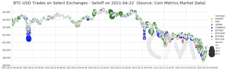 Sàn giao dịch Coinbase có trụ sở tại Hoa Kỳ đã chứng kiến các đề nghị lớn (màu xanh lam) trong 24 giờ qua. Người bán trên Bitfinex (màu xanh lá cây) dường như cũng đóng một vai trò nào đó, theo dữ liệu được Coin Metrics cung cấp.