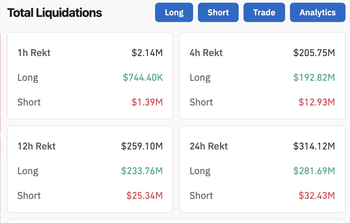 Trong 24 giờ qua, thị trường đã chứng kiến hơn $300 triệu bị thanh lý, với phần lớn xảy ra trong bốn giờ qua, theo dữ liệu từ Coinglass.