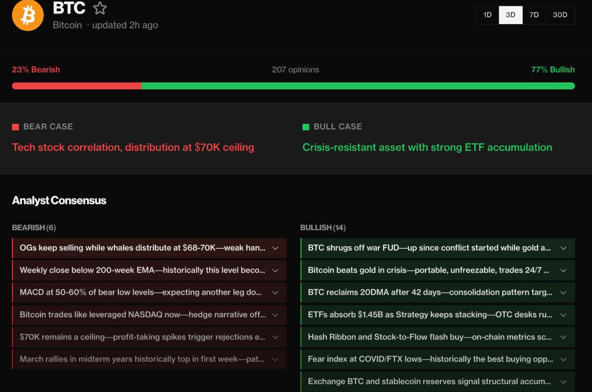 Dữ liệu từ nền tảng theo dõi các nhà phân tích tiền điện tử hàng đầu Unbias cho thấy tâm lý thị trường đang nghiêng rõ rệt về phía lạc quan. Trong ba ngày gần đây, 77% các kịch bản được đưa ra mang xu hướng tăng giá, phần lớn nhờ lực tích lũy mạnh mẽ từ các quỹ ETF Bitcoin.