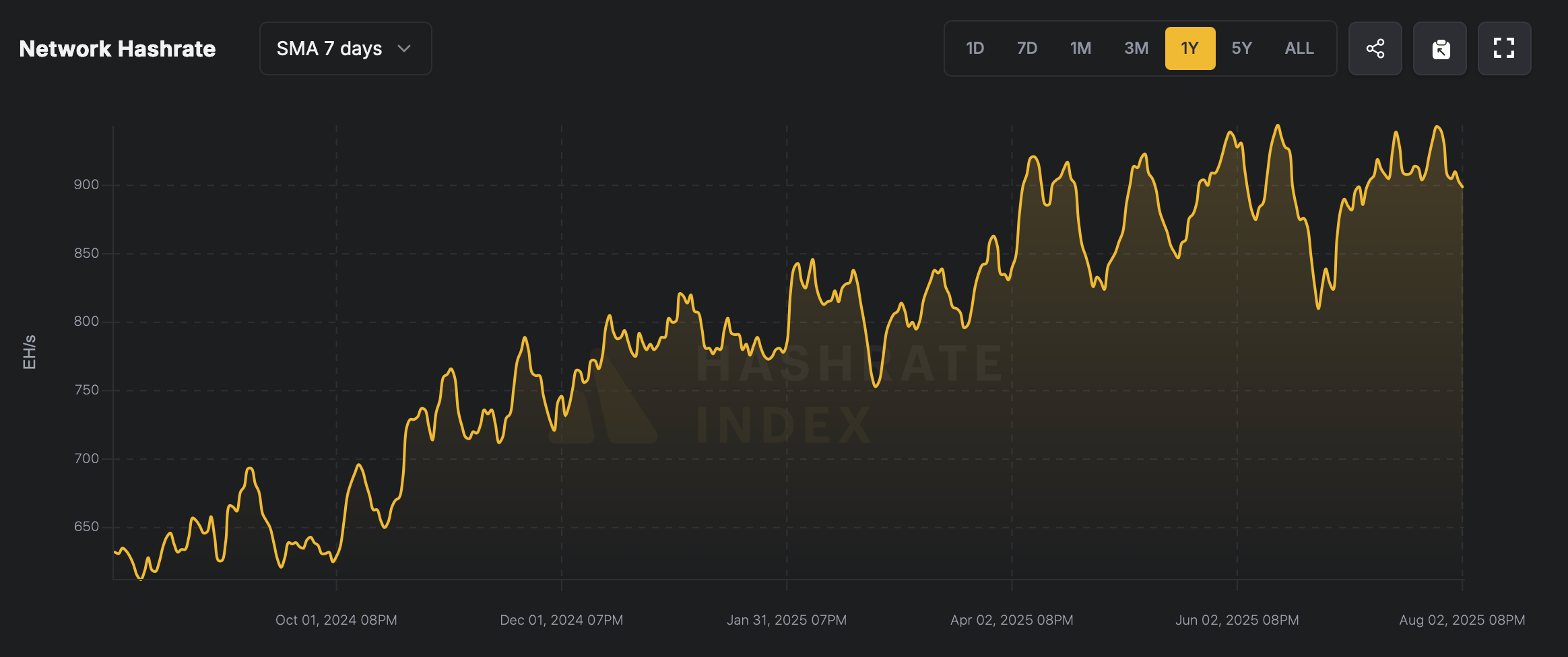 Tính đến ngày 3/8, hashrate toàn mạng cũng đã giảm 4,75% chỉ trong 8 ngày, rơi xuống 898,20 EH/s, thấp hơn mức đỉnh gần nhất 44,8 EH/s và lần đầu xuống dưới ngưỡng 900 EH/s trong thời gian gần đây.