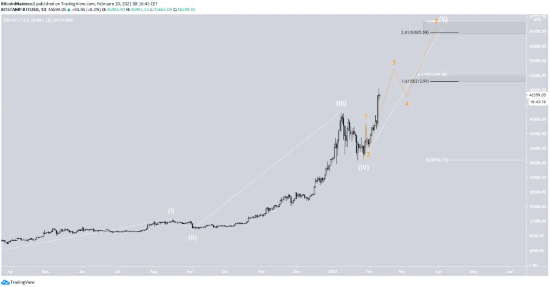 Số lượng sóng dài hạn (màu trắng) chỉ ra BTC đang ở trong sóng 5 của xung động tăng giá bắt đầu vào tháng 3/2020.