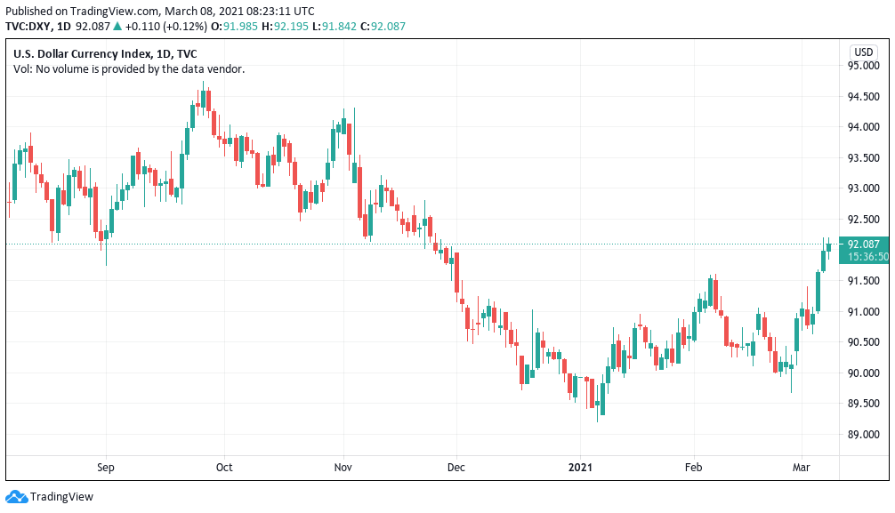 Tăng liên tục từ cuối tháng 2, chỉ số tiền tệ đô la Mỹ (DXY) đã chạm 92,19 vào cuối tuần và giữ trên mốc 92 vào thứ 2. Theo truyền thống, đây là hiện tượng có vấn đề cho sức mạnh giá Bitcoin.