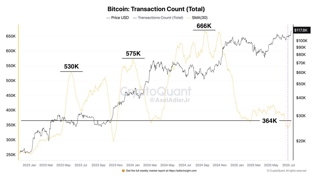 Chuyên gia phân tích Axel Adler Jr. cho biết mạng lưới Bitcoin đang ghi nhận sự gia tăng người dùng ổn định, không xuất hiện dấu hiệu xả hàng hay hoảng loạn. Số lượng giao dịch trung bình hàng ngày đã tăng từ 340.000 lên 364.000 trong hai ngày qua – tuy vẫn còn thấp so với đỉnh cũ 530.000–666.000 giao dịch/ngày. Adler nhận định: