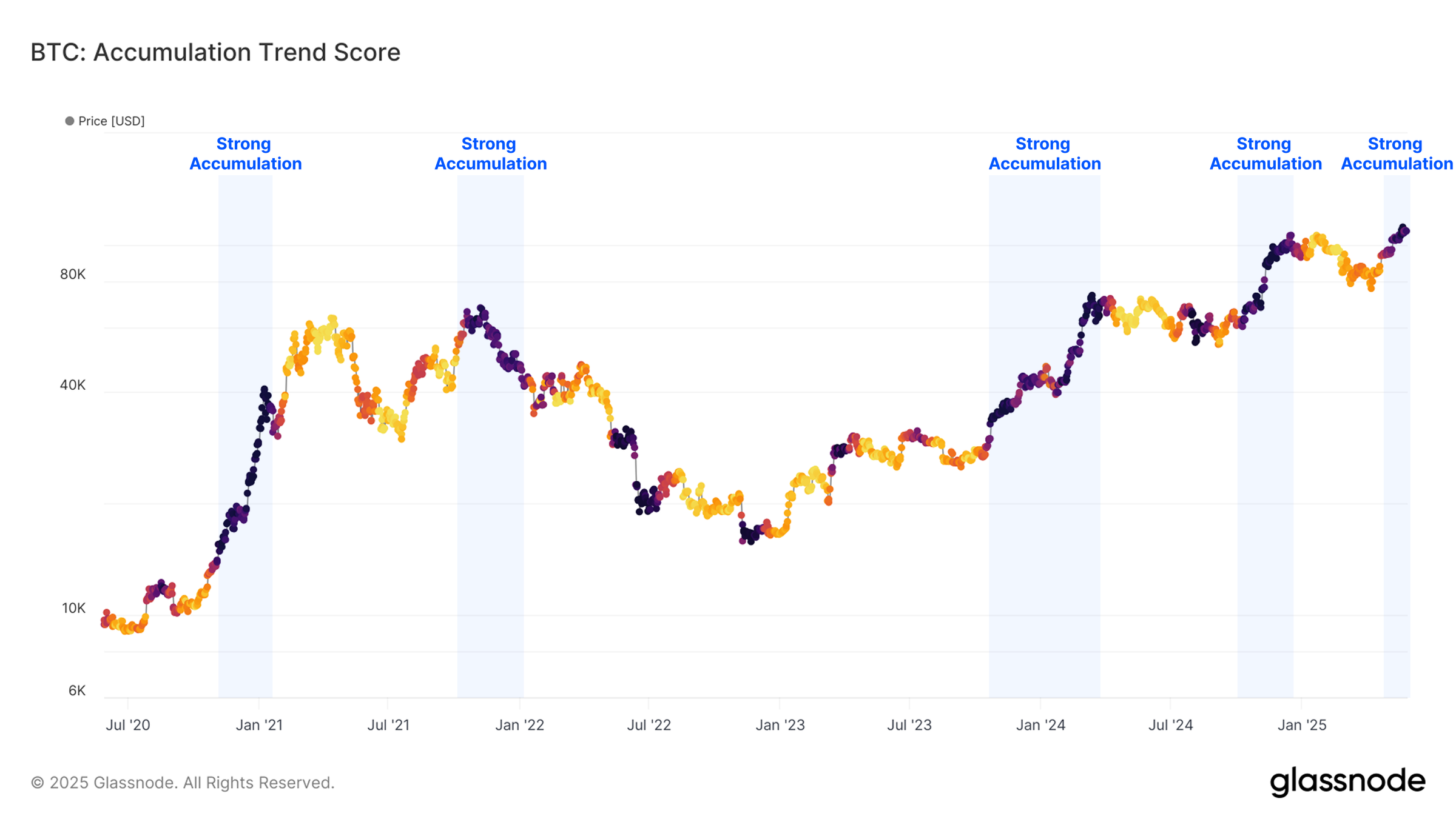 Chỉ số Accumulation Trend Score hiện gần đạt mức tối đa 1.0, phản ánh tâm lý tích cực của nhà đầu tư khi mạnh tay gom hàng trong giai đoạn phát hiện giá. Mô hình tích lũy tương tự từng xuất hiện ở các vùng đỉnh 70.000 USD và 107.000 USD trong năm 2024.