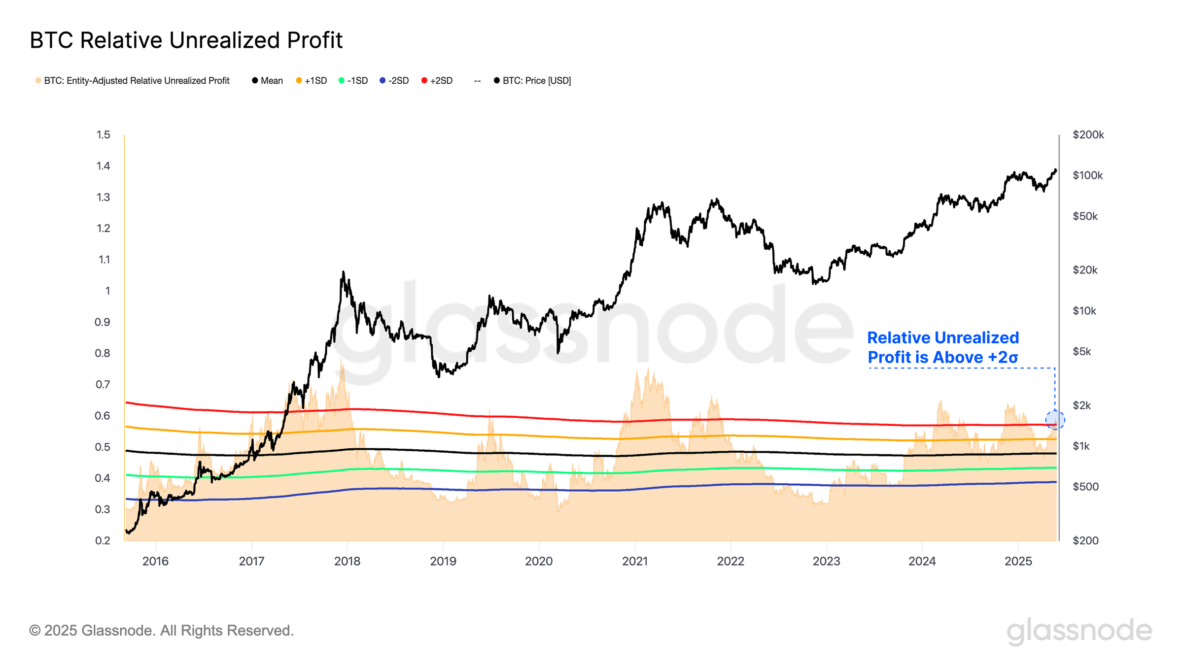 Chỉ số Relative Unrealized Profit (lợi nhuận chưa thực hiện) trên toàn thị trường cũng đang tiến vào vùng hưng phấn cao độ. Chỉ 16% số ngày giao dịch trong lịch sử từng ghi nhận mức lợi nhuận tương tự. Trong khi đó, chỉ số SOPR cho thấy các đồng BTC được chuyển giao gần đây đang mang lại lợi nhuận trung bình 16% cho người bán — nằm trong nhóm 8% ngày có lợi nhuận cao nhất lịch sử.