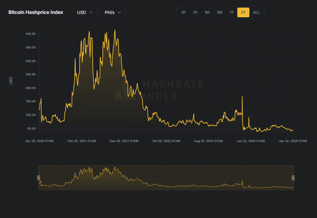 Bitcoin đang giao dịch ở mức trên $88.000, nhưng sau đợt halving vào tháng 4 năm ngoái, thu nhập của thợ đào BTC đã giảm mạnh. Hashprice, doanh thu trên mỗi petahash, bị kẹt ở mức khoảng $45 PH/giây, mức thấp nhất trong 5 năm qua.