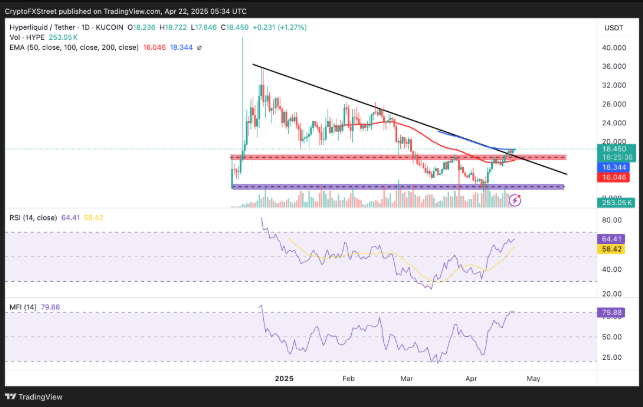 Việc duy trì giá trên EMA 100 ngày ở mức $18,34 sẽ khuyến khích các trader giữ vị thế của họ, tạo ra động lực cho HYPE tăng lên trên $20.