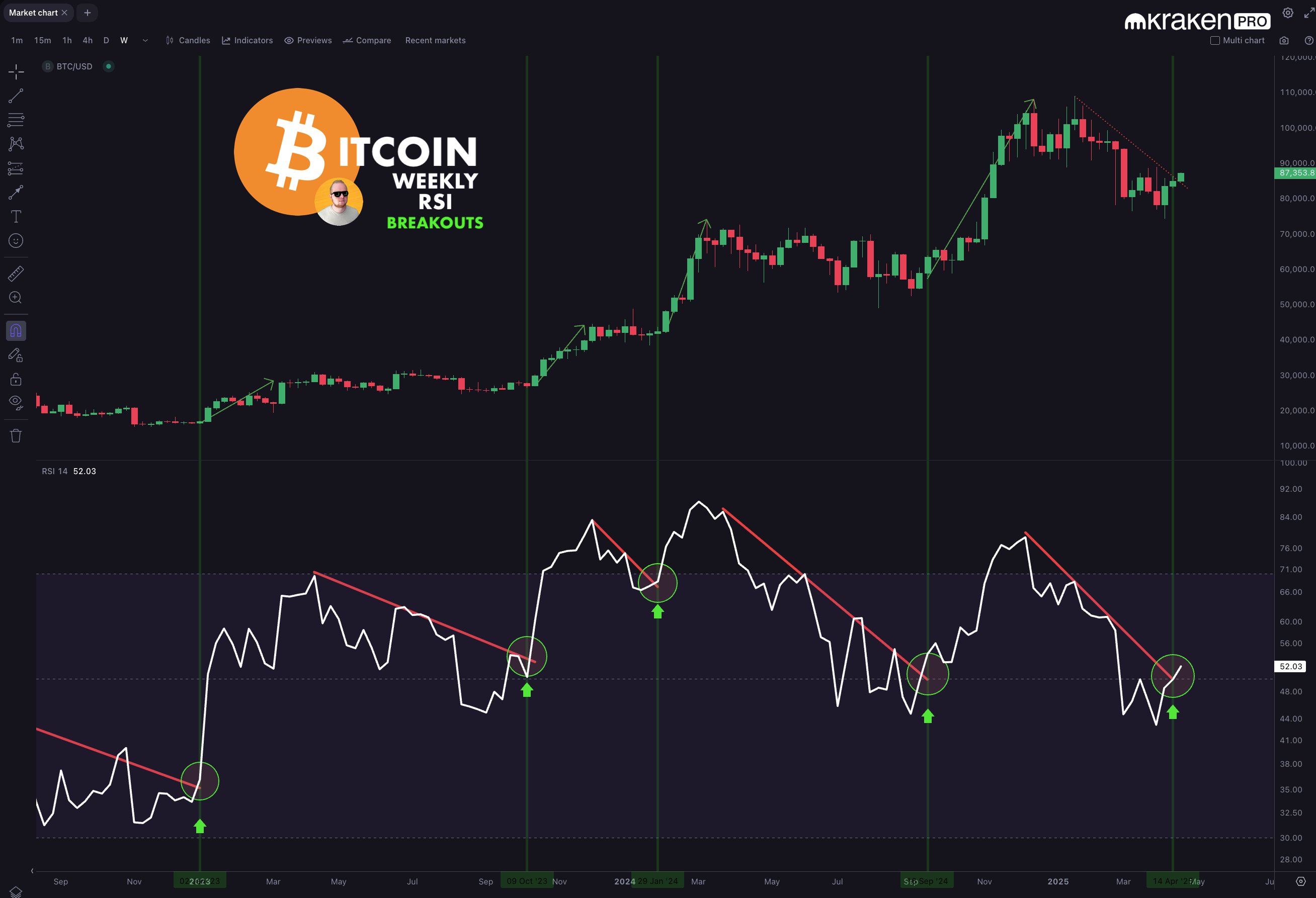 Trader Kevin Svenson nói với 161.100 người theo dõi của mình trên nền tảng truyền thông X rằng, chỉ số sức mạnh tương đối (RSI) của Bitcoin trên biểu đồ hàng tuần đã xác nhận breakout tăng giá sau khi đóng nến tuần trước.