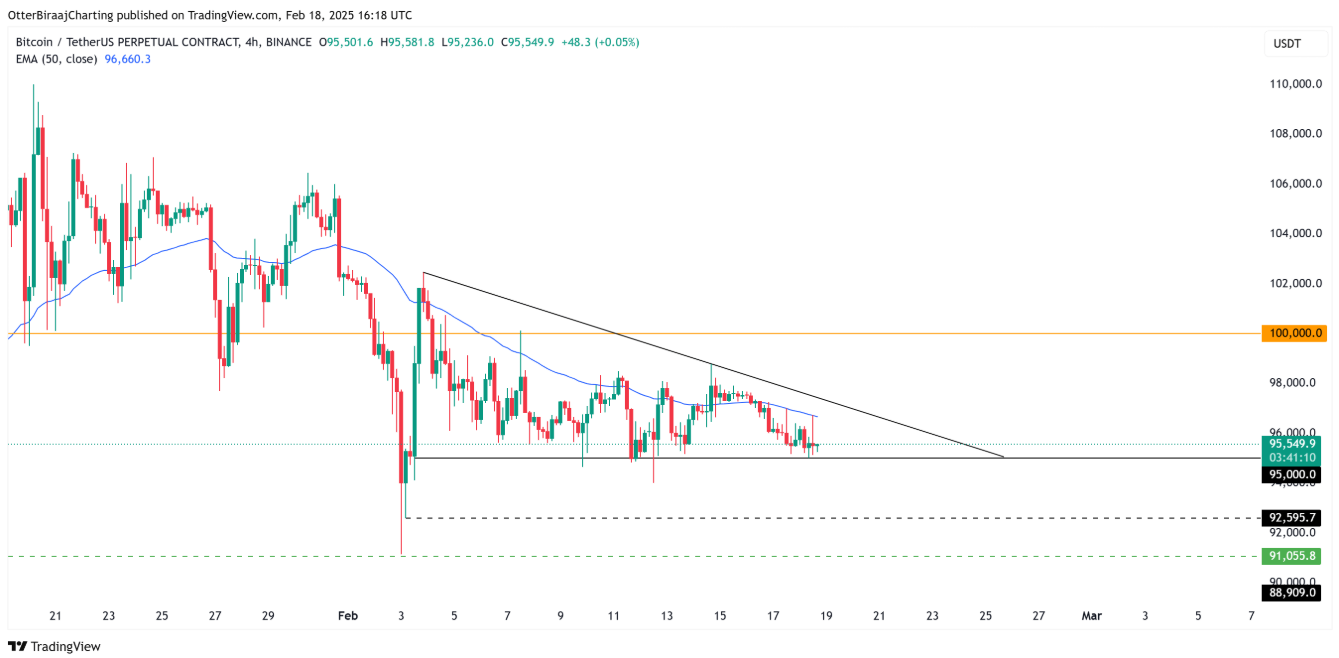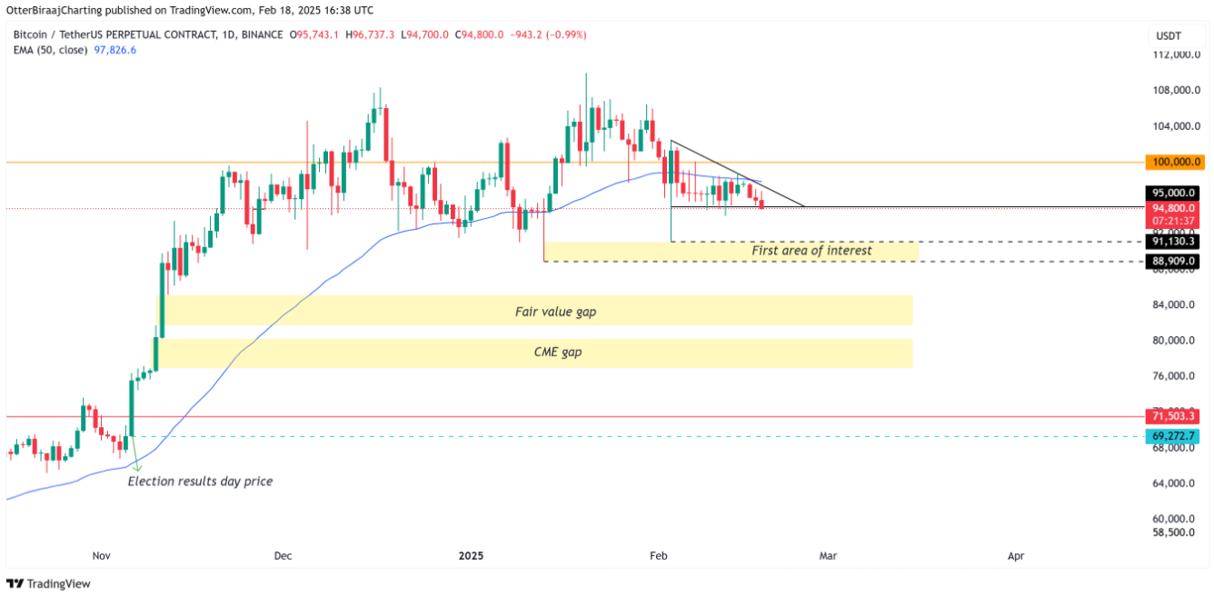 Với việc tài sản số này đang hình thành mô hình tam giác giảm dần trên khung thời gian dài hạn (HTF), thị trường có thể đang chuẩn bị cho một đợt điều chỉnh mạnh xuống dưới $95.000.
