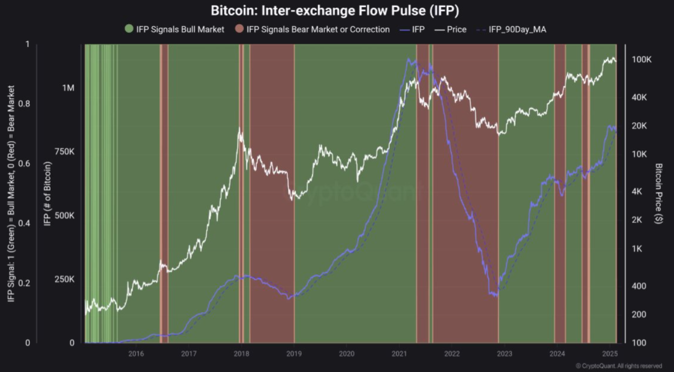 Theo nhà phân tích on-chain Maartunn, chỉ báo dòng chảy liên sàn (Inter-exchange Flow Pulse – IFP) của Bitcoin đã chuyển sang tiêu cực, ngụ ý sự suy giảm khẩu vị rủi ro của các nhà đầu tư tiềm năng.