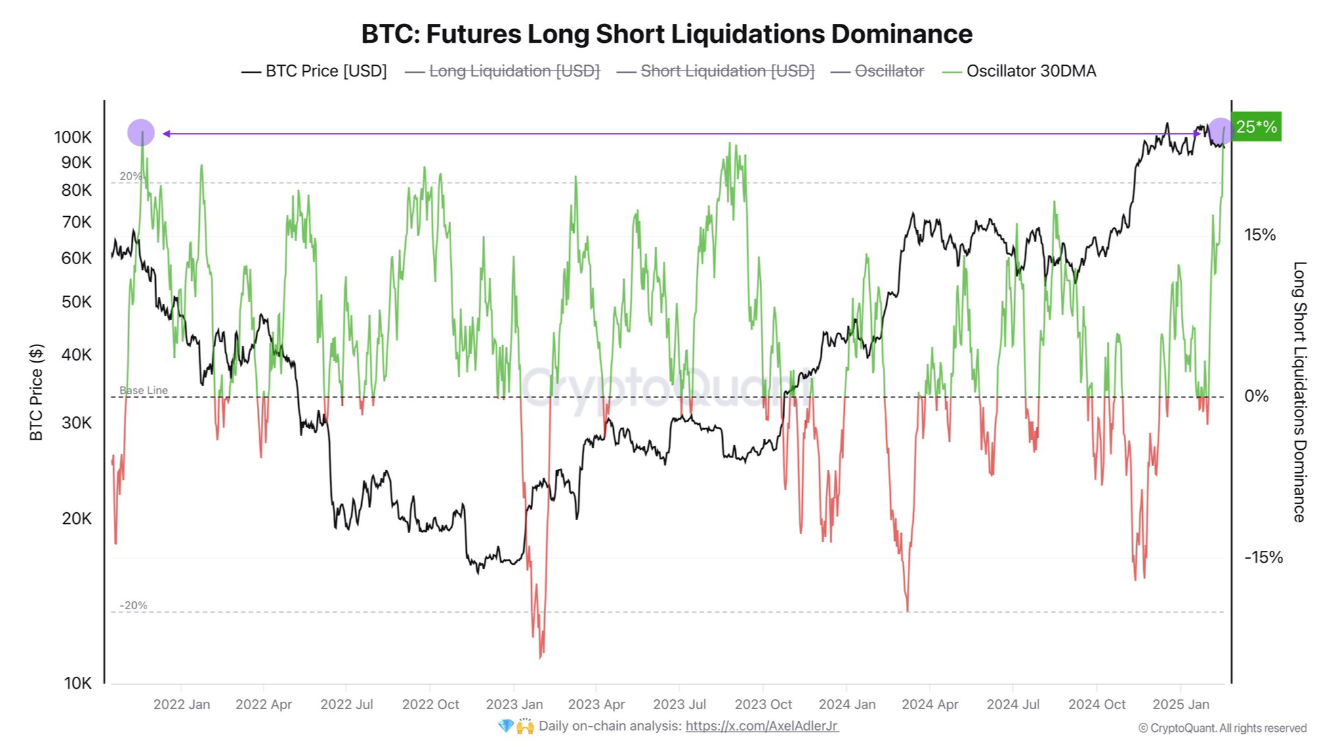 Đồng quan điểm, nhà nghiên cứu Bitcoin Axel Adler Jr. chỉ ra rằng tổng số vị thế mua bị thanh lý trên thị trường hợp đồng tương lai Bitcoin đã đạt mức cao nhất trong hai năm. Ông cho biết lần gần nhất tỷ lệ thanh lý lệnh mua vượt 25% là vào tháng 1/2022, một thời điểm đánh dấu sự khởi đầu của thị trường gấu, sau khi BTC lập đỉnh vào tháng 11/2021.