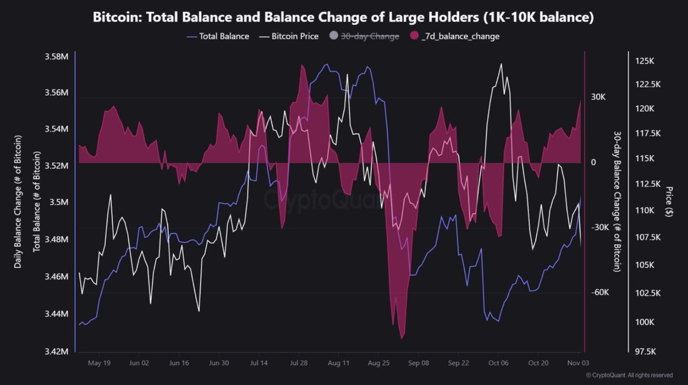 Dữ liệu từ CryptoQuant cũng chỉ ra rằng các “cá voi” nắm giữ từ 1.000 đến 10.000 BTC đã mua thêm khoảng 29.600 BTC trong tuần qua, tương đương gần 3 tỷ USD. Tổng số dư của họ hiện đạt 3,504 triệu BTC, đánh dấu giai đoạn tích lũy lớn đầu tiên kể từ tháng 9.